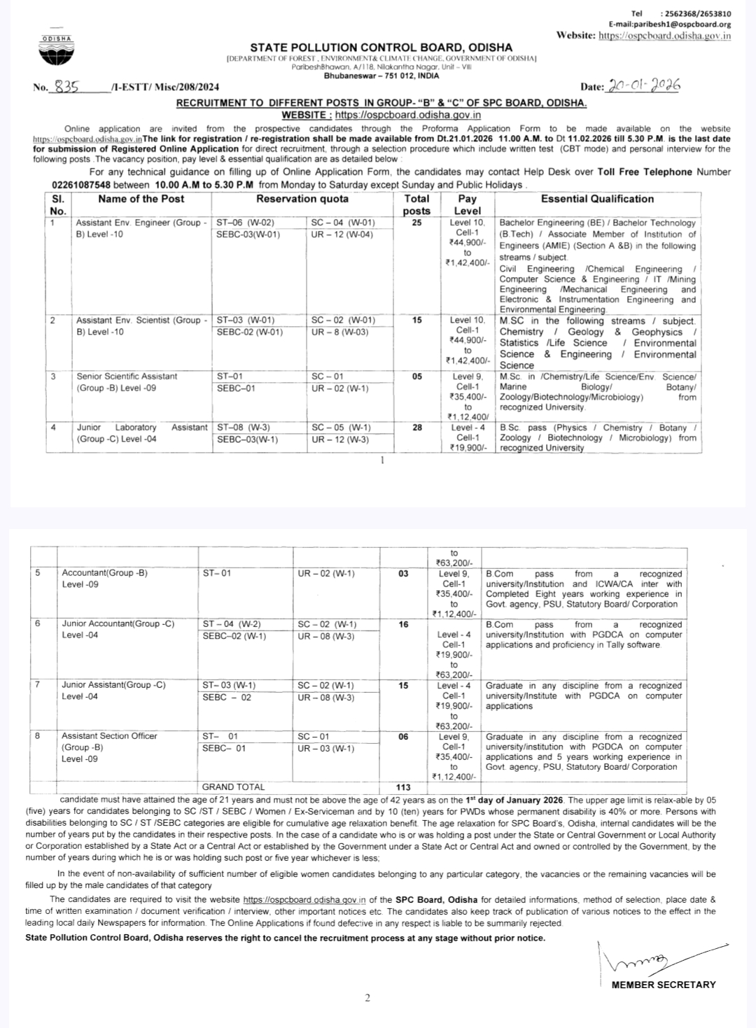 The Odisha State Pollution Control Board (OSPCB) has published the Recruitment Notification for 2026, inviting applications for 113 Group B and Group C positions. Eligible candidates can apply online via the official OSPCB portal. The recruitment includes technical, scientific, and administrative roles across various departments in Odisha.