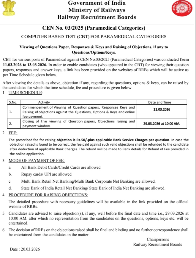 The Computer-Based Test (CBT) for paramedical posts was conducted on March 11, 12, and 13, 2026, and the answer key became available on March 21, 2026. Candidates can access it by logging in with their registration credentials.